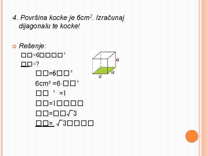 ZADACI – ZA VEŽBANJE 1. Dužina ivice kocke je 4 cm. kolika je ukupna dužina svih ivica te kocke? Kocka ima ukupno 12 ivica, pa dužina svih ivica te kocke je 12∙ 4=48 cm.