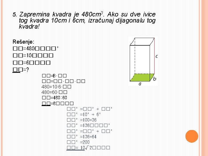 2. Kolika je površina kvadra čije su vice 4 cm, 3 cm i 2 cm? Rešenje: a=4 cm b=3 cm c=2 cm P=? P=2 B + M P=2(ab+bc+ac) P=2(4∙ 3+3∙ 2+2∙ 4) P=2(12+6+8) P=2∙ 26 P=52 cm²