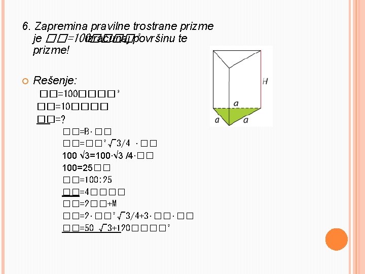 3. Osnovna ivica pravilne četvorostrane prizme je 11 cm, a visina 2 cm. Izračunaj zapreminu te prizme! Rešenje: ��=11���� ��=2���� ��=? ��=B∙�� ��=��²∙�� ��=11 ² ∙ 2 ��=121∙ 2 ��=242����³