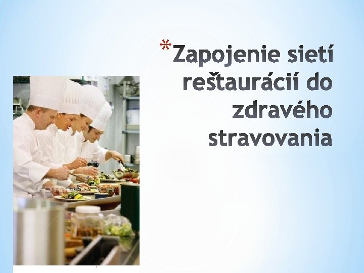 *Zdravšie spôsoby prípravy *Aké zásady zdravého stravovania presadzuje ? jedál – napr. na pare, grile *Ponúkanie polovičných porcií jedál *Zníženie konzumácie kuchynskej soli *Mäsité jedlá z hydiny, hovädzie, rybacie *Väčšia ponuka cereálnych pokrmov *Viac zeleninových a ovocných jedál a dezertov *Nápoj - voda
