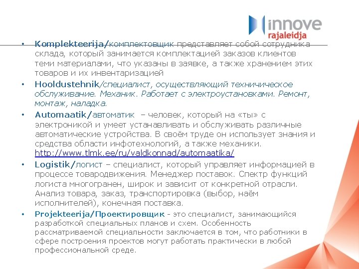 * kõrgharidus * kutseharidus * kursused, töökohal õppimine Tootmises töötavad - Kontoris töötavad Puidupingi operaator, metallitööpingi operaator** CNC-pingi operaator, CNC-stantspingi operaator** Keevitaja/сварщик** Lukksepp/слесарь** Komplekteerija/комплектовщик* Hooldustehnik/специалист, осуществляющий технич. обслуживание* Kvaliteedikontroll* Laotöötaja, logistik/логист*** Vahetuse vanem/главный смены* Automaatik/автоматик* Turvatöötaja Painutuspingi operaator/оператор листосгибочногостанка** Tõstukijuht/руководитель подъемника* Elektrik* Tootmisseadme operaator/оператор производственных станков** Mehhatroonik* - Juht, direktor * Juhiabi * Personalitöötaja/специалист по управлению персоналом* Insener* Tootmisjuht, tootmistehnoloog/управляющий производством, менеджер по производству** Müügispetsialist, müügijuht/специалист по продажам** Ostuspetsialist/специалист по закупкам** Projektijuht** Hinna eelarvestaja/* Raamatupidaja/бухгалтер** Finantsjuht/финансовый директор* Hangete ja strateegilise ostu juht/рук-ль по поставкам и закупкам** Konstrueerimisinsener* Tehnoloog** Tehniline konsultant** Koristaja Projekteerija/проектировщик** Müügispetsialist**