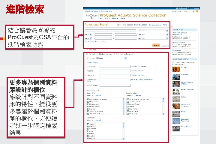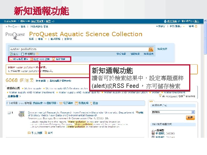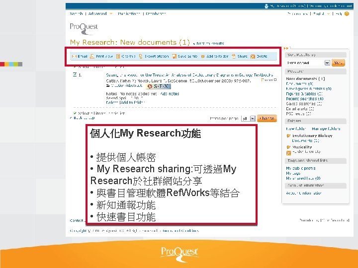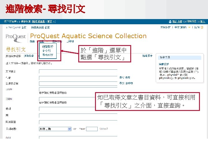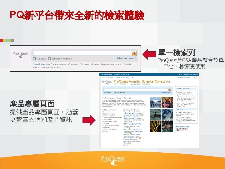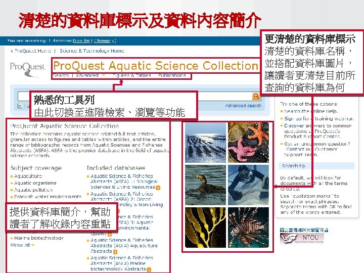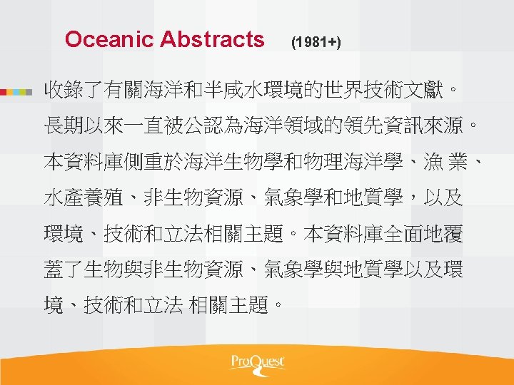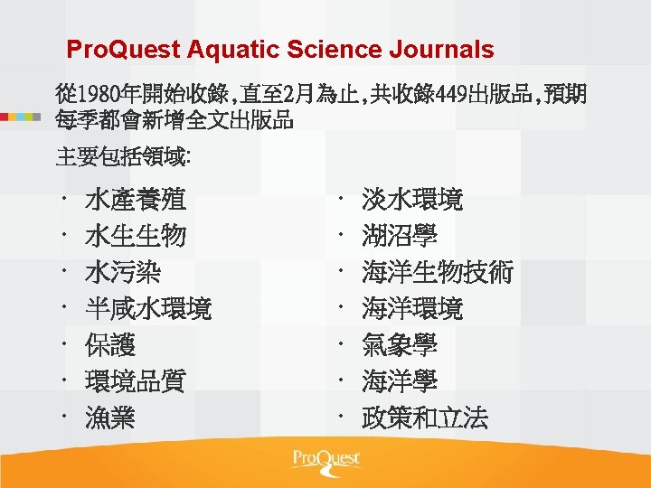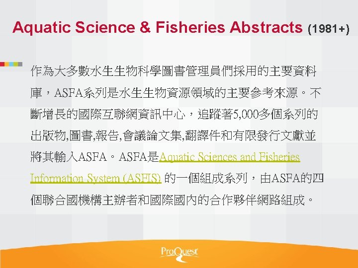 Pro Quest Aquatic Science Collection National Taiwan Ocean Slides: 34 Download presentation Pro. Quest Aquatic Science Collection National Taiwan Ocean University. 2011 Pro. Quest Aquatic Science Collection n 2011年新出版 n ASFA 升級版 相關全文部份 n 水生生物科学領域專門全文系列 ASFA Oceanic Abstracts Pro. Quest Deep Indexing – Aquatic Pro. Quest Aquatic Science Journals Pro. Quest Aquatic Science Collection ASFA: Aquatic Sciences and Fisheries Abstracts ASFA 1: Biological Sciences Pro. Questand Living Resources Technology Research Database ASFA 2: Ocean Technology, Policy and Non-Living Resources ASFA 3: Aquatic Pollution and Environmental Quality Pro. Quest High ASFA Aquaculture Abstracts Pro. Quest Aquatic Technology CSA Engineering Research Database with METADEX with Aerospace Abstracts ASFA Marine Biotechnology Pro. Quest Aquatic Science Journals (440+ publications) Pro. Quest Aquatic Science Journals (440+ publications) Pro. Quest Aquatic Science Journals (440+ publications) Pro. Quest Aquatic Science Journals (440多種出版物 ) 出版品名稱 收錄年代 Ausmarine 1/9/2009+ Environmental Biology of Fishes 1/2/2001+ Global Biogeochemical Cycles 1/9/2009+ Journal of Physical Oceanography 1/6/1998+ Marine Biotechnology 1/12/2002+ Marine Turtle Newsletter 1/1/2009+ National Fisherman 1/11/2000+ Nature 4/1/1990+ Nature Biotechnology 1/1/2000+ EMBO Journal 4/1/2000+ Reviews in Fish Biology and Fisheries 1/1/1997+ Paleoceanography 1/9/2009+ Western Journal of Applied Forestry 1/1/2001+ Pro. Quest Deep Indexing – Aquatic Science Thank you Any question ?