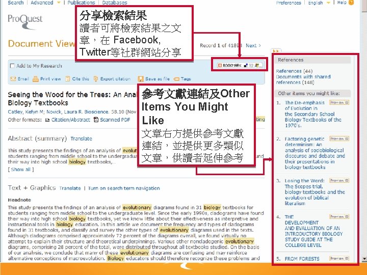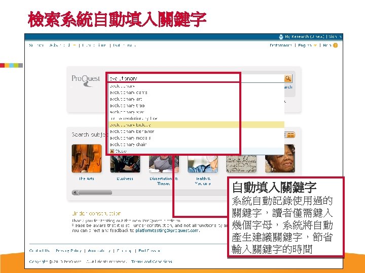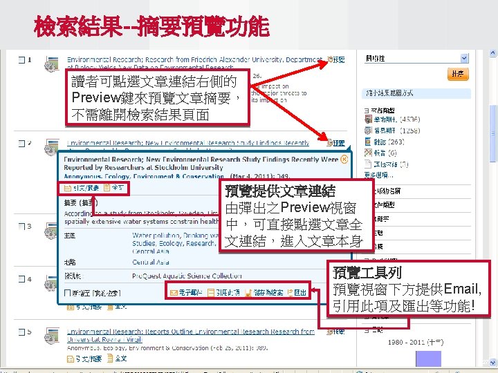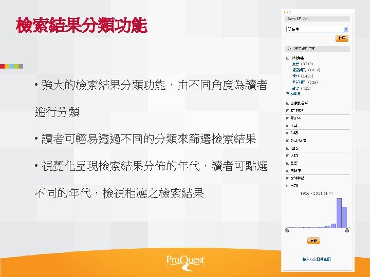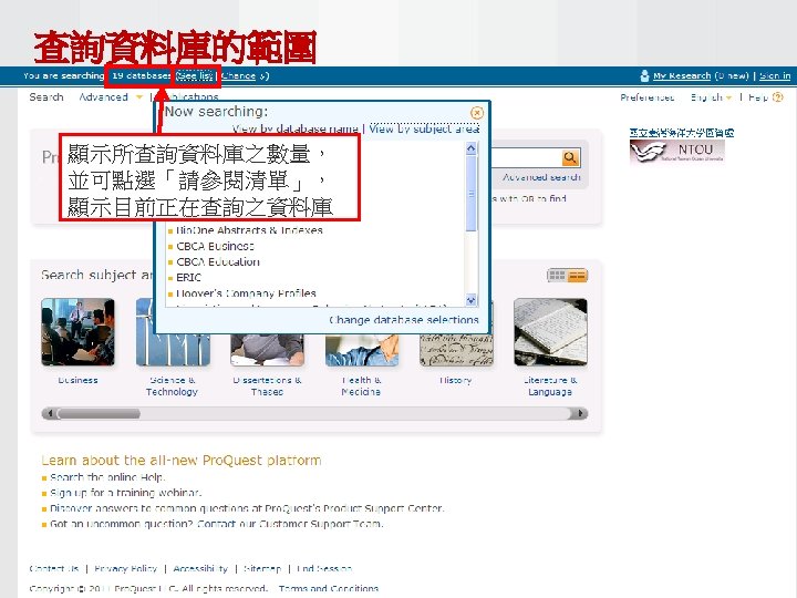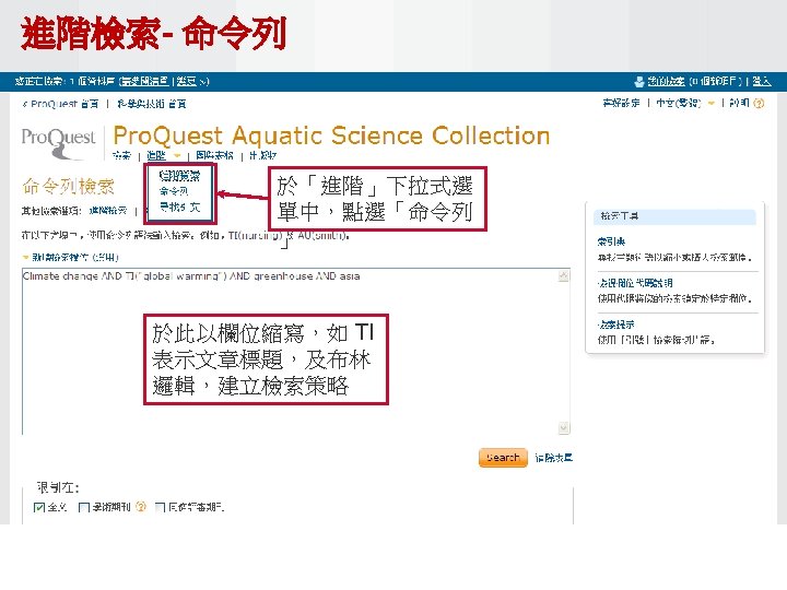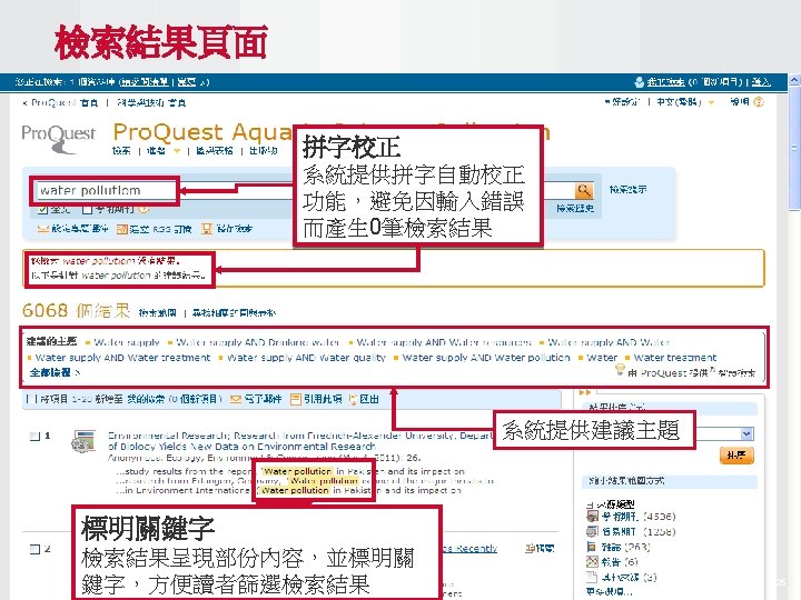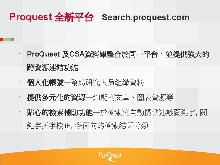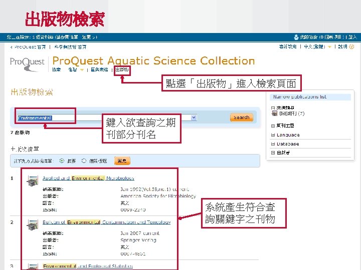 Pro Quest Aquatic Science Collection National Taiwan Ocean Slides: 34 Download presentation Pro. Quest Aquatic Science Collection National Taiwan Ocean University. 2011 Pro. Quest Aquatic Science Collection n 2011年新出版 n ASFA 升級版 相關全文部份 n 水生生物科学領域專門全文系列 ASFA Oceanic Abstracts Pro. Quest Deep Indexing – Aquatic Pro. Quest Aquatic Science Journals Pro. Quest Aquatic Science Collection ASFA: Aquatic Sciences and Fisheries Abstracts ASFA 1: Biological Sciences Pro. Questand Living Resources Technology Research Database ASFA 2: Ocean Technology, Policy and Non-Living Resources ASFA 3: Aquatic Pollution and Environmental Quality Pro. Quest High ASFA Aquaculture Abstracts Pro. Quest Aquatic Technology CSA Engineering Research Database with METADEX with Aerospace Abstracts ASFA Marine Biotechnology Pro. Quest Aquatic Science Journals (440+ publications) Pro. Quest Aquatic Science Journals (440+ publications) Pro. Quest Aquatic Science Journals (440+ publications) Pro. Quest Aquatic Science Journals (440多種出版物 ) 出版品名稱 收錄年代 Ausmarine 1/9/2009+ Environmental Biology of Fishes 1/2/2001+ Global Biogeochemical Cycles 1/9/2009+ Journal of Physical Oceanography 1/6/1998+ Marine Biotechnology 1/12/2002+ Marine Turtle Newsletter 1/1/2009+ National Fisherman 1/11/2000+ Nature 4/1/1990+ Nature Biotechnology 1/1/2000+ EMBO Journal 4/1/2000+ Reviews in Fish Biology and Fisheries 1/1/1997+ Paleoceanography 1/9/2009+ Western Journal of Applied Forestry 1/1/2001+ Pro. Quest Deep Indexing – Aquatic Science Thank you Any question ?