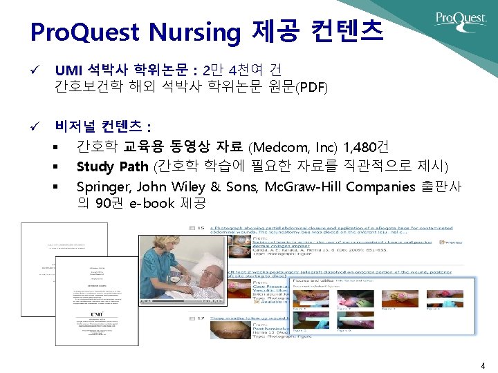 Pro. Quest Nursing 제공 컨텐츠 간호, 보건학 분야 학술 저널 : 1, 997여종 서지초록 / 1, 614여 종의 원문 저널은 간호학, 보건학, 건강관리 응급처치, 임상의학 분야 등 간호전반을 포괄하고 있어, 간호학 연구활동에 실용적이며 활용성이 높은 기사를 제공 간호학 분야 아티클에서 제공하는 이미지 : 도표, 그래프, 사진 등을 Deep indexing 함 • American Journal of Electroneurodiagnostic Technology • American Journal of Occupational Therapy • Journal of Allied Health • Journal of Nuclear Medicine Technology • Journal of Rehabilitation • Journal of Neuroscience Nursing • Journal of Practical Nursing • Rehabilitation Nursing • Orthopaedic Nursing • Association of Operating Room Nurses. AORN Journal • Diabetes Care • Gerontological Nursing Association. Perspectives • Clinical Trials • Alternative Therapies in Health and Medicine 3