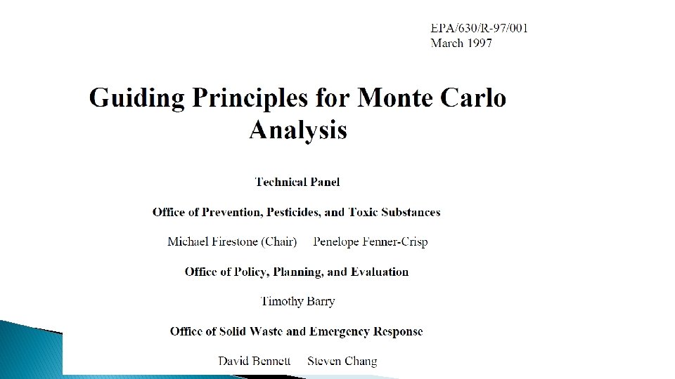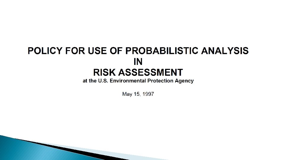 EPA’s “Deterministic” Risk Assessments � “The Agency has developed simplified approaches to characterize risks associated with such complex assessments through the use of point estimates for model variables or parameters. Such an approach typically produces point estimates of risks (e. g. , 10‐ 5 or a lifetime probability of cancer risk of one individual in 100, 000). These often are called “deterministic” assessments. As a result of the use of point estimates for variables in model algorithms, deterministic risk results usually are reported as what are assumed to be either average or worst‐case estimates. They do not contain any quantitative estimate of the uncertainty in that estimate, nor report what percentile of the exposed population the estimate applies. ” (EPA, 2014)