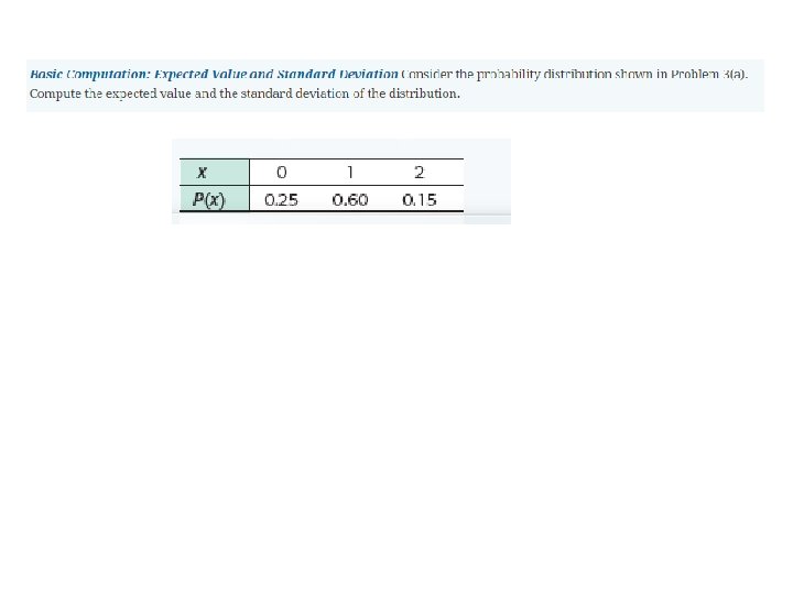 Example 2 – Solution cont’d The average number of times a buyer views the infomercial before purchase is = x. P(x) = 2. 54 (sum of column 3) To find the standard deviation, we take the square root of the sum of column 6: