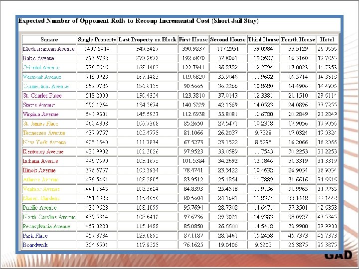 Conclusions on Monopoly • Railroads are excellent investments, particularly when owned together. • The best return on investment is from putting a third house on New York Avenue. It has the fastest payoff of any building on almost all of the properties. • The square most landed on other than Jail is Illinois Avenue, a hotel there will bring the most income other than a hotel on Boardwalk. • The worst investment is to buy Mediterranean Avenue without first owning Baltic Avenue. • The properties between the Jail square and the Go To Jail square landed on the most, because of the jump caused by landing on Go To Jail. • The Orange ones have the biggest bang for the buck as far as building goes.