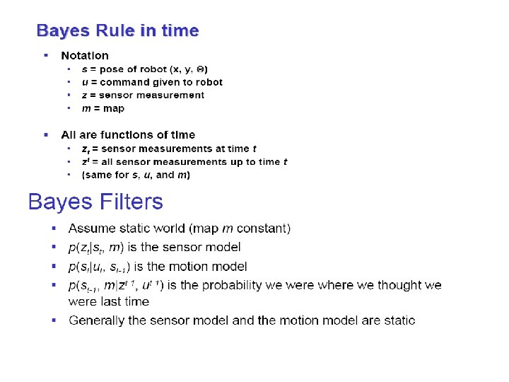 Terminology • Robot State (or pose): xt =[ x, y, θ] – Position and heading – x 1: t = {x 1, …, xt} • Robot Controls: ut – Robot motion and manipulation – u 1: t = {u 1, . . . , ut} • Sensor Measurements: zt – Range scans, images, etc. – z 1: t = {z 1, . . . , zt} • Landmark or Map: – Landmarks or Map