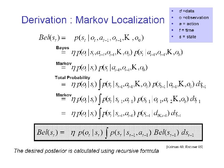 Derivation : Markov Localization Bayes Markov Total Probability Markov