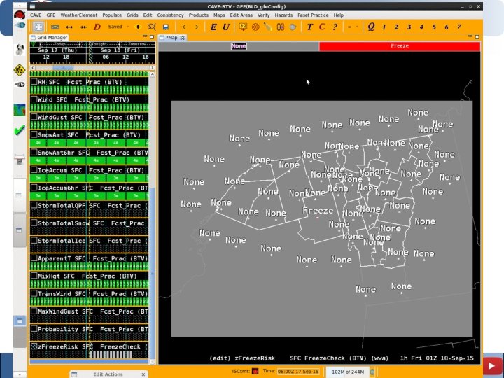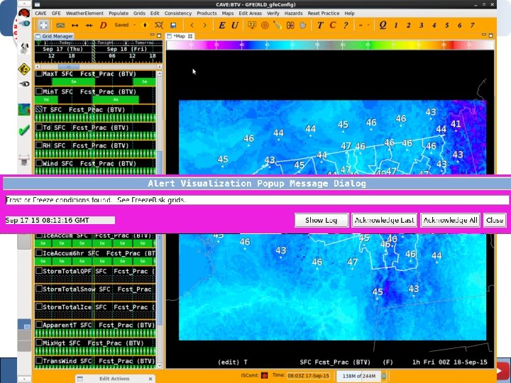 Hazard Check - Summary • Allows a forecaster to quickly view both spatially and temporarily where gridded forecasts support hazard issuance • Can be run on Local CWA or ISC • Helps determine exact starting/end points for hazard headlines • Useful in crossover advisory-> warning time periods.