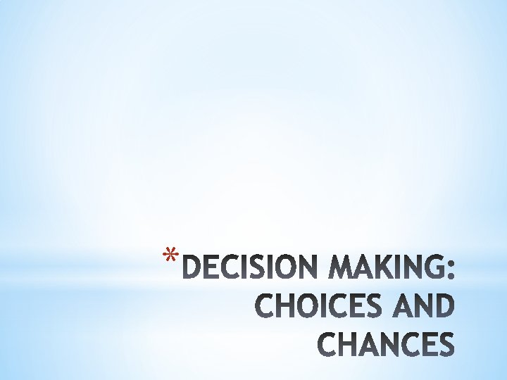*Risky decision making: making choices under conditions of uncertainty *Expected value: do you expect to gain or lose *Subjective utility: is it personally worth it to you *Subjective probability: sometimes you need to rely on your personal estimates of probabilities *
