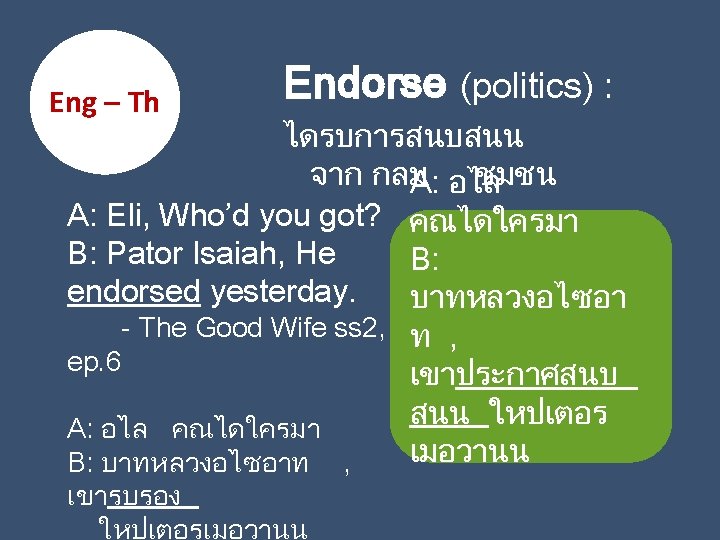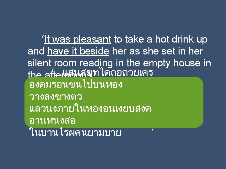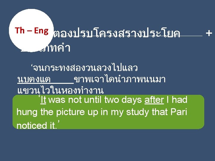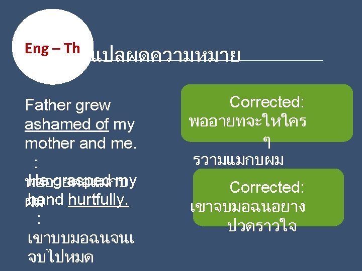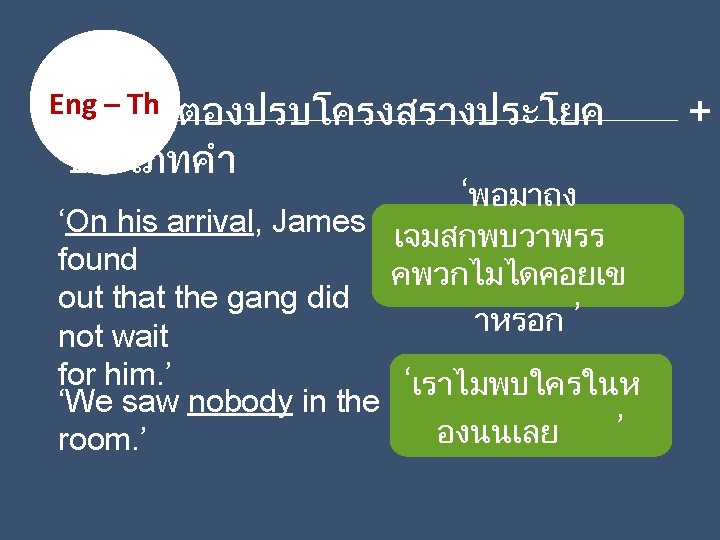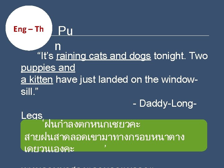 Eng – Th Metaphor/ similes ‘ Words are like leaves : and where they most bound ‘คำพดเปรยบได Much fruit of sense beneath is rarely ดจใบพฤกษา found. ’ ทใดมดกหนาแน - Alexander น Pope ยอมหาผลแหงคว ามหมายไมม ’ (สญฉว