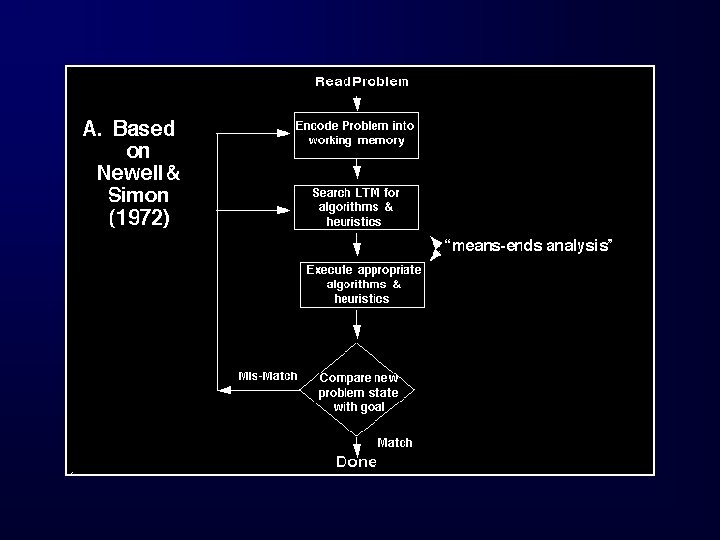 Important Ideas in Problem-Space Theory • Problem-space refers to the abstract structure of a problem • Operators are specific knowledge structures that transform data • Algorithm: method or procedure • Heuristics: strategies, “rules of thumb” – means-end analysis: calculate difference between current state and goal; create a subgoal to reduce that difference; select an operator that will solve this subgoal • Subgoal structure – essentially are short- and long-term goals