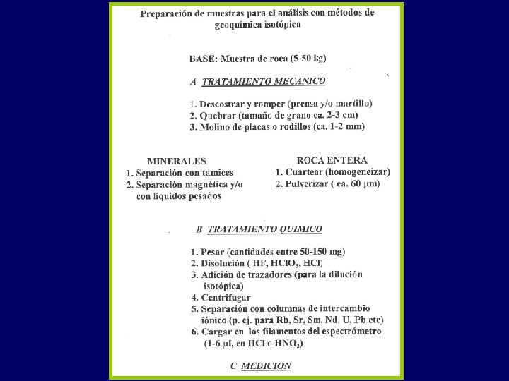CONSIDERACIONES IMPORTANTES 1. Elegir el método en función del tipo de material que se va a analizar. 2. Determinar los factores que pueden afectar las relaciones isotópicas, P. ej. La estratigrafía, intemperismo, etc. 3. Evitar trabajar con rocas alteradas, que hayan tenido influencia del agua de río o del mar, verificar que no contengan vetillas secundarias de calcita o sílice. 4. Etiquetar las muestras en forma adecuada. 5. Contar por lo menos con 10 -30 kg de muestra de roca.