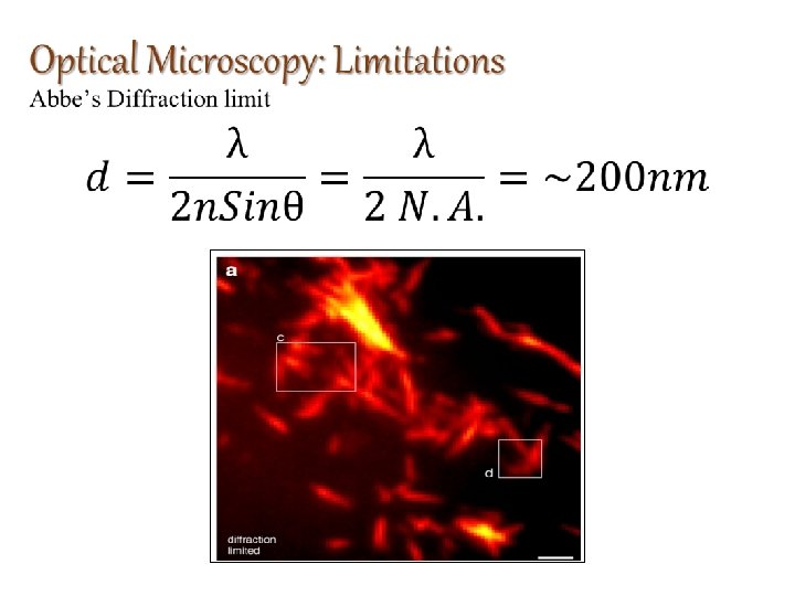 Way-out: Super resolution Microscopy or Nanoscopy: Two approaches 1. Improved optics to achieve sub-wavelength resolution. Techniques include NSOM, SIM, STED etc. • Pros: High resolution super resolved image • Cones: Costly optics, Experimentally challenging. 2. Intelligent methodology to achieve super resolution with wide-field setup e. g. Localization Microscopy • Superresolved image with conventional wide-field setup