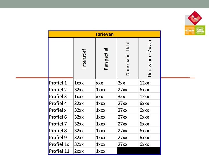 WAT STAAT ER VAST? • • • Profielen en intensiteiten Hoofdaannemerschap Tarieven Regie Rol toegang Gebruik perspectiefplan