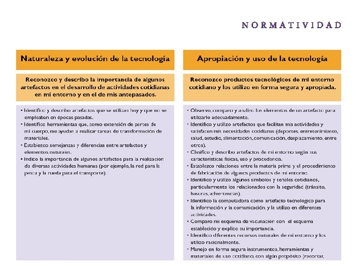 1994 • Ley General de la Educación 1996 • Documento de Trabajo: Educación en Tecnología 1996 • Resolución 2343 • Lineamientos Generales e Indicadores de logros curriculares por grado 2008, Orientaciones Generales para la Educación en Tecnología (Competencias)