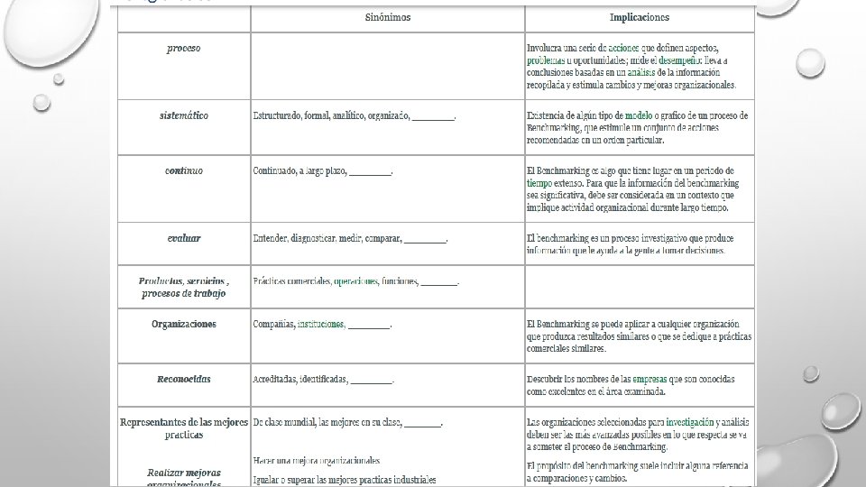 DEFINICION BENCHMARKING UN : • PROCESO(1) • SISTEMÁTICO(2) Y • CONTINUO(3)PARA • EVALUAR(4) • LOS PRODUCTOS(5) • SERVICIOS (5)Y • PROCESOS DE TRABAJO(5) • DE LAS ORGANIZACIONES(6) • QUE SON RECONOCIDAS(7)COMO • REPRESENTANTES DE LAS MEJORES PRACTICAS(8) • CON EL PROPÓSITO DE REALIZAR MEJORAS