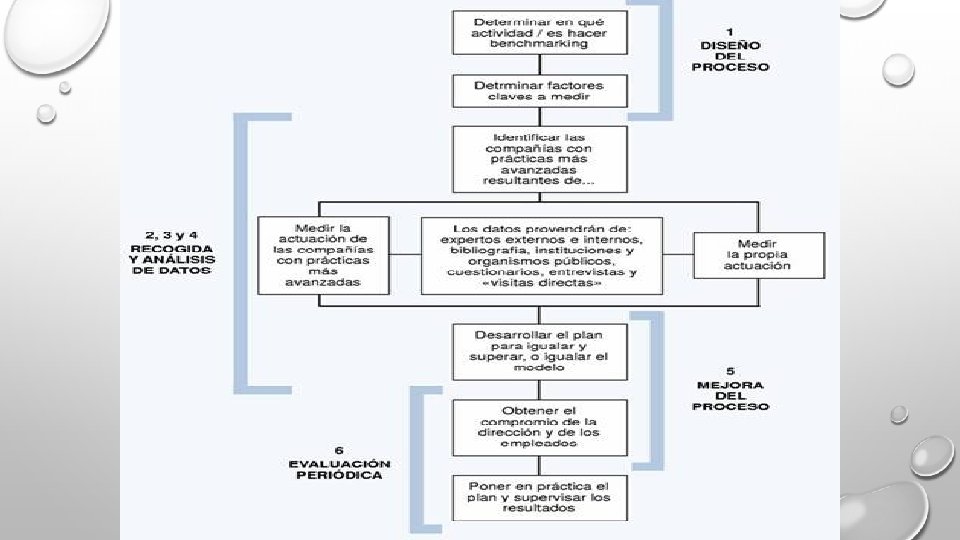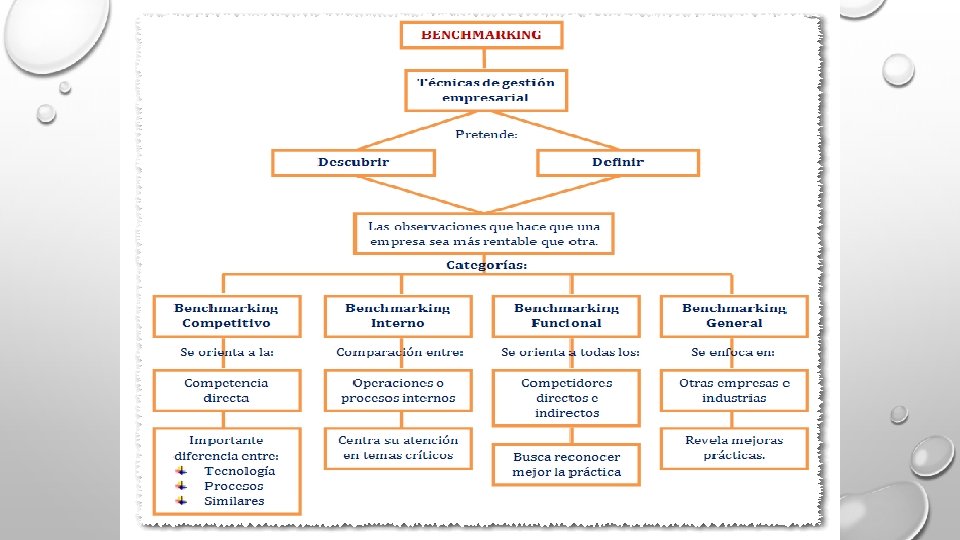 ¿QUÉ COSAS SOMETER AL PROCESO DE BENCHMARKING? • PRODUCTOS Y SERVICIOS: ANÁLISIS COMPETITIVO • PROCESOS DE TRABAJO: DEFINEN EL CÓMO ES LA PRODUCCIÓN DE BIENES Y SERVICIOS. • FUNCIONES DE APOYO: RECURSOS HUMANOS, FINANCIERO, MARKETING, ETC. • DESEMPEÑO ORGANIZACIONAL: COSTOS E INGRESOS. • ESTRATEGIA: ENTENDER LAS VENTAJAS COMPETITIVAS DE LOS DEMÁS.