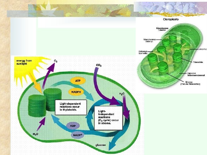 n La reacción general se puede resumir de esta manera: enzimas/co-enzimas 6 CO 2 + 6 H 2 O + energía de luz (dióxido de carbono) (agua) clorofila C 6 H 12 O 6 + 6 O 2 (glucosa) (oxígeno) n La luz solar es la fuente de energía que atrapa la clorofila, un pigmento verde que se encuentra en los cloroplastos, que las células vegetales utilizan para la fotosíntesis. n El bióxido de carbono y el agua son las materias primas. n Las enzimas y las coenzimas controlan la síntesis de glucosa, a partir del bióxido de carbono y el agua.