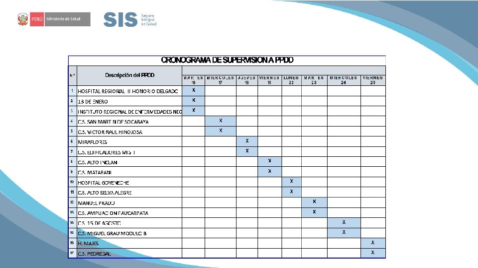• En atención al Memorando Circular N° 084 -2018 -SIS-SG. El Área de Informática de la UDR Arequipa, presenta PLAN DE VISITA INOPINADA a PPDD ACTIVIDADES A DESARROLLAR: • Verificar la generación del paquete de información (trama) • Concurrencia de múltiples usuarios • Actualización de Versiones del ARFSIS • Generación de copias de seguridad de las bases de datos. • Acceso al servicio de Internet.