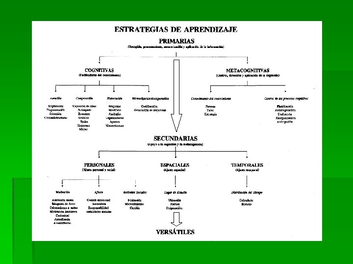 Estrategias de aprendizaje § Primarias o de producción § Cognitivas: § Atención § Comprensión § Elaboración § Memorización/recuperación § Metacognitivas: § Conocimiento del conocimiento: persona, tarea y estrategia § Control del proceso de conocimiento: § Planificación § Autorregulación § Evaluación § Reorganización (feedback) § Anticipación (forward) § Secundarias o de apoyo § Personales: Control emocional y de la ansiedad, motivacionales, autoconcepto, autoestima y autoeficacia § Espaciales: Lugar y condiciones § Temporales: Calendario y horario § Materiales: Recursos necesarios § Versátiles