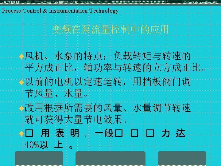 Process Control & Instrumentation Technology 流量、扬程、轴功率 与转速关系 t流量: t扬程: t轴功率: