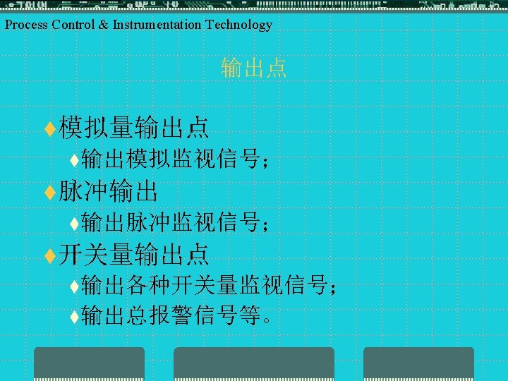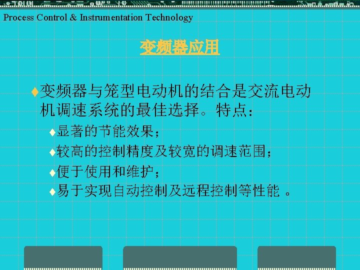 Process Control & Instrumentation Technology 电力电子元件 t. SCR、GTO、GTR、IGBT、MOS、 MCT 等; t. IGBT是电力MOSFET和GTR的有机结合,具 有MOSFET驱动功率小、开关频率高和GTR 作电流大的特点; t. MCT(门控晶闸管)是MOSFET和SCR的有 机结合。