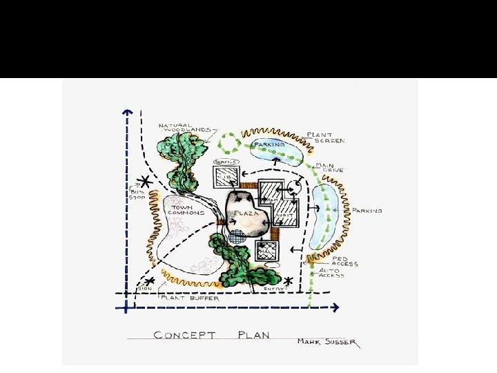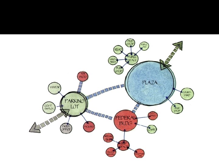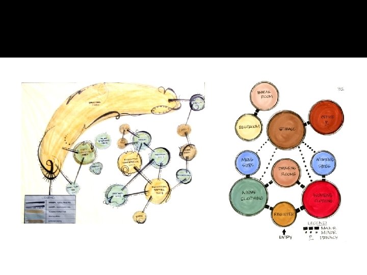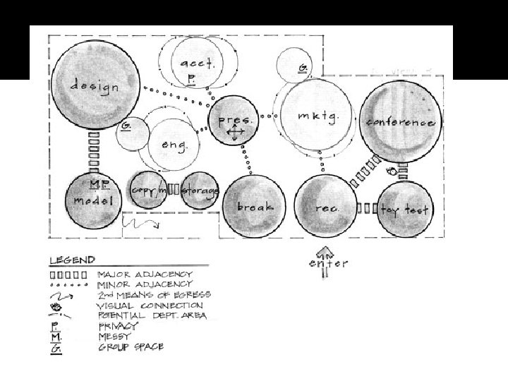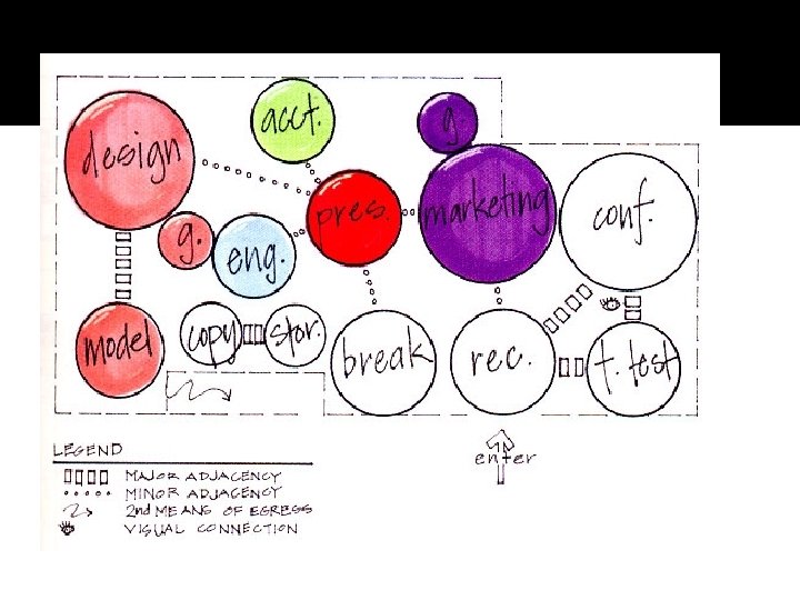 Bubble (relationship) Diagram Draw circles for each space required Size of circle should relate to sq. footage Spaces requiring adjacencies should be close to each other (or touch) Use connecting lines (graphic symbols) to indicate adjacencies and major circulation. Should not relate to building shell Room names and sq. footages indicated Views, privacy etc. should be indicated. Must include a legend.