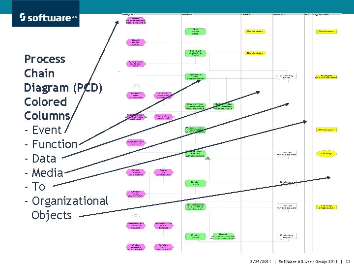 Process Chain Diagram (PCD) Colored Columns - Event - Function - Data - Media - To - Organizational Objects 2/24/2021 | Software AG User Group 2011 | 33