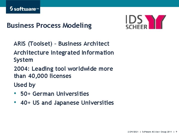 Business Process Modeling ARIS (Toolset) – Business Architecture Integrated Information System 2004: Leading tool worldwide more than 40, 000 licenses Used by • 50+ German Universities • 40+ US and Japanese Universities 2/24/2021 | Software AG User Group 2011 | 9