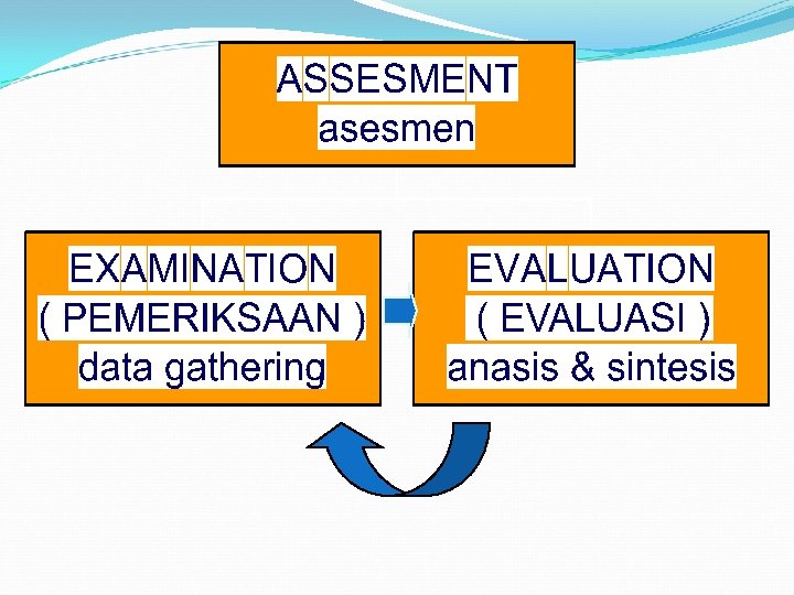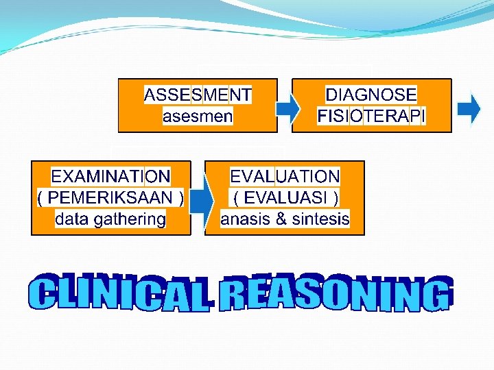 evaluasi evaluation of the results of the examination through analysis and synthesis within a process of clinical reasoning. Pemeriksaan Data - data Evaluasi • Analisis • Sintesis Clinical reasoning