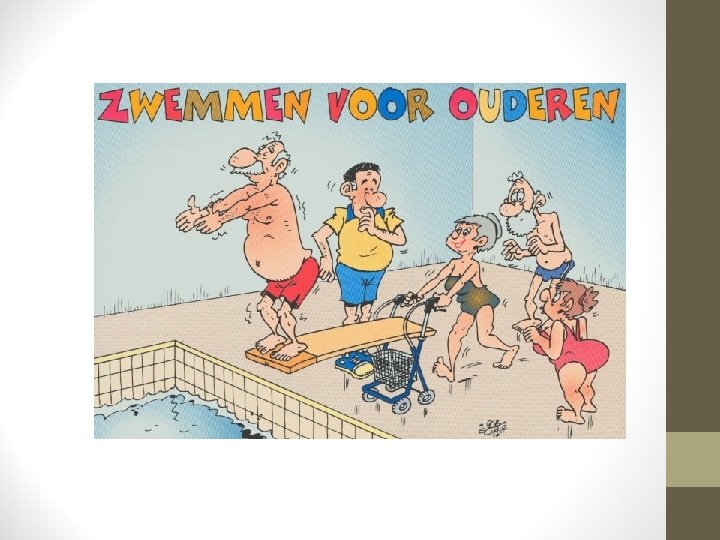 Beleving en welbevinden • Op cognitief gebied ontstaan op een moment veranderingen: • De reactiesnelheid vermindert • Het geheugen vermindert • Mensen ervaren dit op verschillende manieren: • Het kan heel bedreigend zijn • Men kan ook proberen te genieten zo lang het kan • Niet vergelijken met vroeger helpt ook