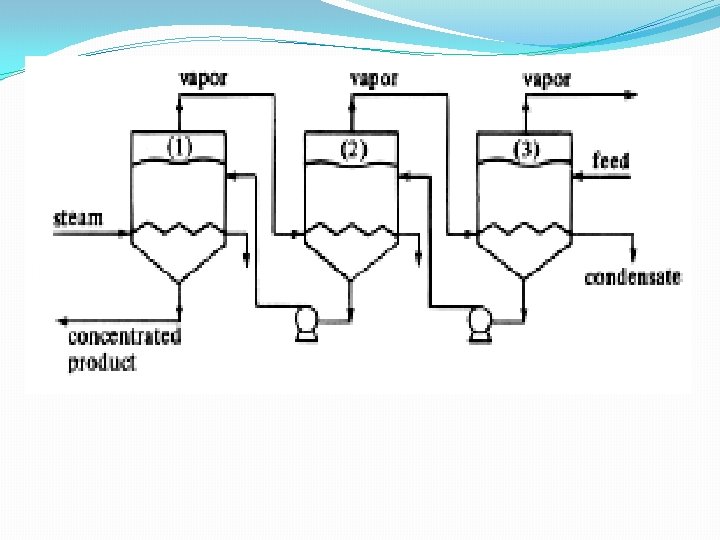 • Figure, the fresh feed is added to the first effect and flows to the next in the same direction as the vapor flow. • This method of operation is used when the feed is hot or when the final concentrated product might be damaged at high temperatures. • The boiling temperatures decrease from effect to effect. This means that if the first effect is at P 1 = 1 atm abs pressure, the last effect will be under vacuum at pressure P 3.