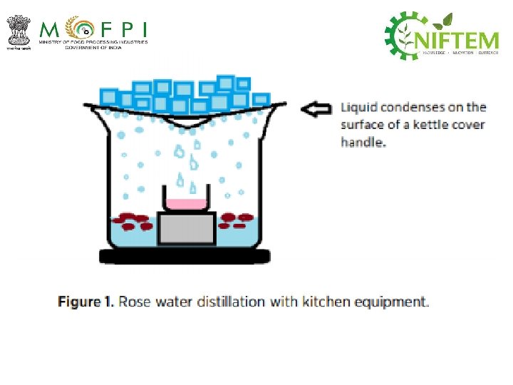 Flow chart for rose water making using Kitchen equipment Instrument Fill a quarter of the pot with water Place the distillate receiving cup at the centre of the pot on the configuration so that the receiving cup is not in water Cut the petals to strips and place them in the water and put the lid on it, place upside down If the lid has a handle in the middle it acts as a good collector for the liquid from which the distillate drops directly fall into the receiving cup Bring the water to boil When the water starts to boil fill the lid of the pot with crushed ice to keep the lid cool and the vaporising liquid is effectively condensed on the lid’s inner surface, from where it drips into the receiving cup. distillate from the Let the liquid simmer at a mild temperature. Then collect receiving cup at even intervals for example with a syringe or a pipette. Gather distillate three times into different bottles at six minute intervals