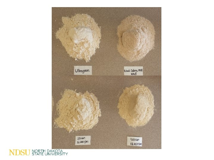 WHOLE-WHEAT RETSCH FLOUR VS COMMERICAL FLOUR • Color and Starch Damage Ultragrain 250 µm, 12, 000 rpm Dakota Mill WWF 500 µm, 18, 000 rpm Lightness Starch Damage (%) 84. 2 82. 6 77. 7 78. 5 5. 6 9. 7 3. 7 5. 5
