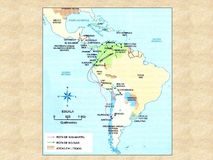 Grandes líderes ►Precursor: Tupac Amaru / Peru , 1780/81 ► Simon Bolívar “o Libertador”: republicano defendia uma América do sul livre, unida e forte (partiu da Venezuela e Peru em direção ao sul) ► José de San Martín: Monarquista, partiu da Buenos Aires em direção ao norte (MOVIMENTO SULISTA)