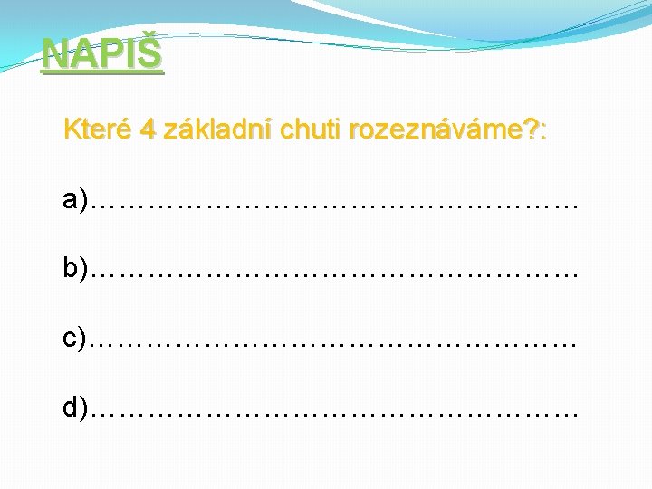 NAPIŠ Které 4 základní chuti rozeznáváme? : a)……sladkou…………… b)……kyselou…………… c)……slanou……………. . d)……hořkou…………….