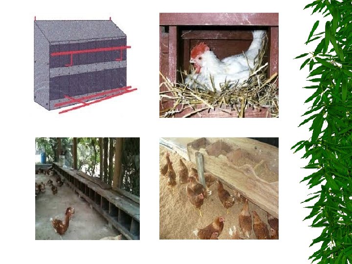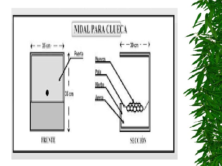 Nidos Cuando las aves se explotan en piso es necesario colocar los nidos que pueden ser de madera o de lámina galvanizada (ideal) disponiendo un hueco de 30 a 35 cm de ancho por 30 cm de alto y 35 cm de profundidad, por cada 68 aves.