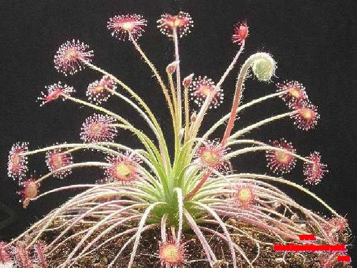 • Pelos pegajosos - Drosera, Byblis, Drosophyllum La Drosera posee hojas en rosetas pegadas al suelo que segregan un fluido viscoso con aroma parecido al de la miel. Cuando un insecto se posa en la hoja, queda atrapado en los pegajosos. Después los tentáculos de la Drosera se curvan hacia adentro hasta que se cierran. Puede tardar desde un minuto a varias horas en cerrar. Luego, pasan entre 7 y 14 días hasta que los tentáculos de la Drosera se abren completamente. La planta reconoce si le sirve el alimento o no, ya que si, por ejemplo, colocas un grano de arena, sus hojas no se cierran. • Cucuruchos - Sarracenia, Darlingtonia, Heliamphora Tienen un receptáculo donde caen los insectos y al querer salir, no pueden debido unos pelos invertidos (Sarracenia) o porque chocan contra manchas traslúcidas que piensan que son salidas (Darlingtonia californica), con lo que caen agotados al fondo de la trampa y se ahogan en el líquido digestivo