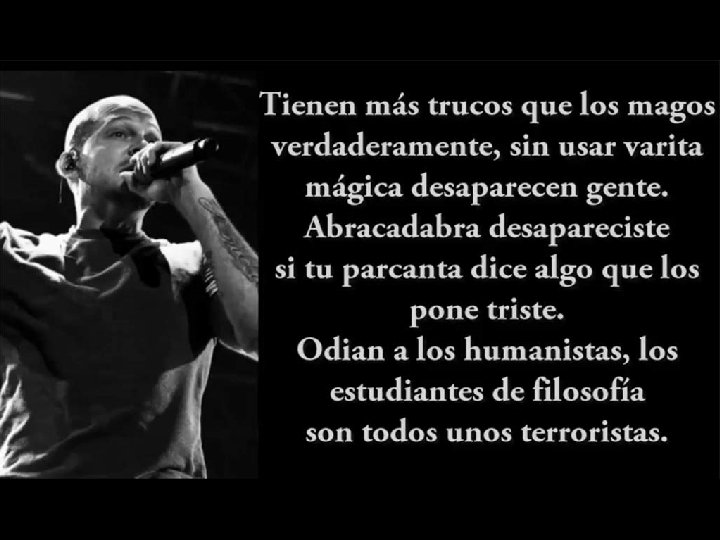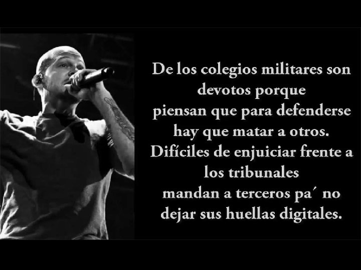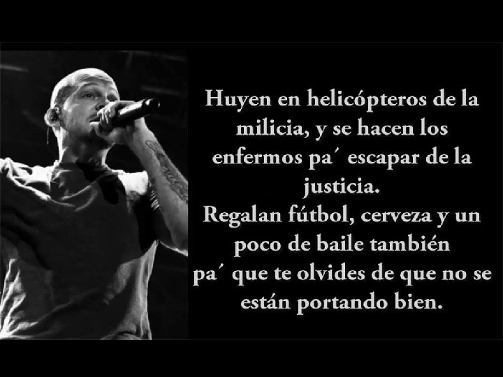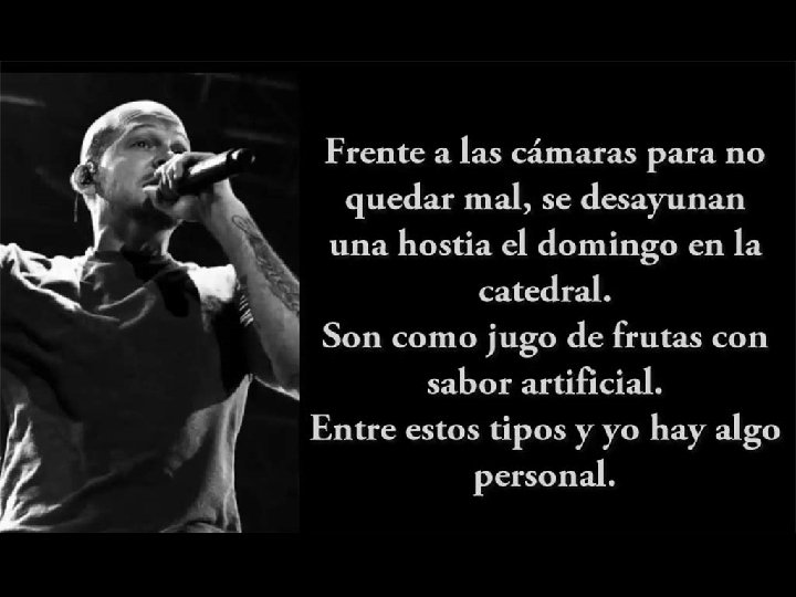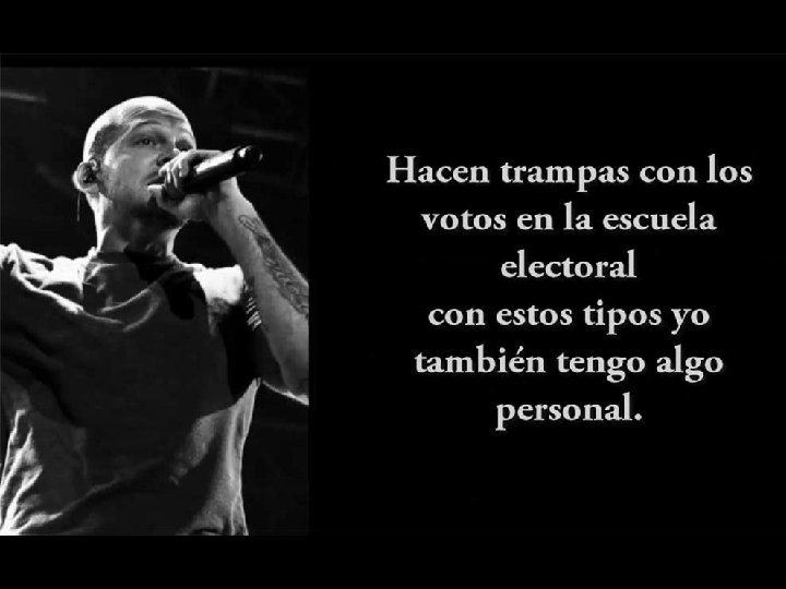 Y como quieren la cosa nada tienen que perder Pulsan la alarma y rompen promesas Probablemente en su pueblo se les recordará Y en nombre de quien no tienen el gusto de Como cachorros de buenas personas conocer Que hurtaban flores para regalar a su mamá Nos ponen la pistola en la cabeza. Y daban de comer a las palomas. Se agarran de los pero para no ensuciar Probablemente que todo eso debe ser verdad Van a cagar a casa de otra gente Aunque es más turbio como y de qué manera Y experimentan nuevos métodos para masacrar Llegaron esos individuos a ser lo que son Sofisticados y a la vez convincentes. Ni a quién sirven cuando alzan las banderas. No conocen ni a su padre cuando pierden el Hombres de paja que usan la colonia y el honor control Para ocultar oscuras intenciones. Ni recuerdan que en el mundo hay niños Tienen doble vida, son sicarios del mal, Nos niegan a todos el pan y la sal Entre esos tipos y yo hay algo personal. Rodeados de protocolo, comitiva y seguridad Pero eso sí, los sicarios no pierden la ocasión Viajan de incógnito en autos blindados De declarar públicamente su empeño A sembrar calumnias, a mentir con naturalidad En propiciar un diálogo de franca distensión A colgar en las escuelas su retrato. Que le permita hallar un marco previo Se gastan más de lo que tienen en coleccionar, Que garantice unas premisas mínimas Espías, listas negras y arsenales. Que faciliten crear los resortes Resulta bochornoso y verlos fanfarronear Que impulsen un punto de partida sólido y A ver quién es el que la tiene más grande. Se arman hasta los dientes en el nombre de la paz capaz De este a oeste y de sur a norte Juegan cosas que no tienen repuesto Donde establecer las bases, de un tratado de Y la culpa es del otro si algo les sale mal. amistad Entre esos tipos y yo hay algo personal. Que contribuya a poner los cimientos De una plataforma donde edificar Usa ahora el ratón Un hermoso futuro de amor y paz.