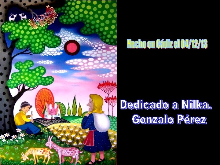 Visita la web de mi amigo Gonzalo: entra en Google y escribe GONPE: ahí está “El mundo del arte”. O directamente pincha aquí: http: //gonpichuelo. es Los Angeles, CA Yo soy la autora de la letra de "Cantaré, cantarás", y mi primo me envió tu pps desde Argentina. Me encantó y me emocionó. Te lo agradezco profundamente. No sólo por haber tratado mi canción con tanto amor, sino por tomarte el tiempo y la energía para diseminar el mensaje de la paz. Luego seguí el link a tu web, que me parece sensacional, y que visitaré a menudo. Este es el tipo de comunicación que necesitamos. Dios te bendiga. Anahi van Zandweghe