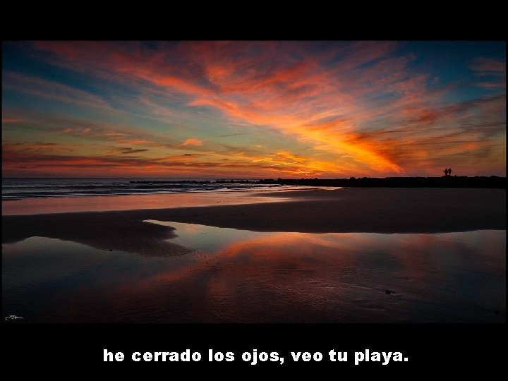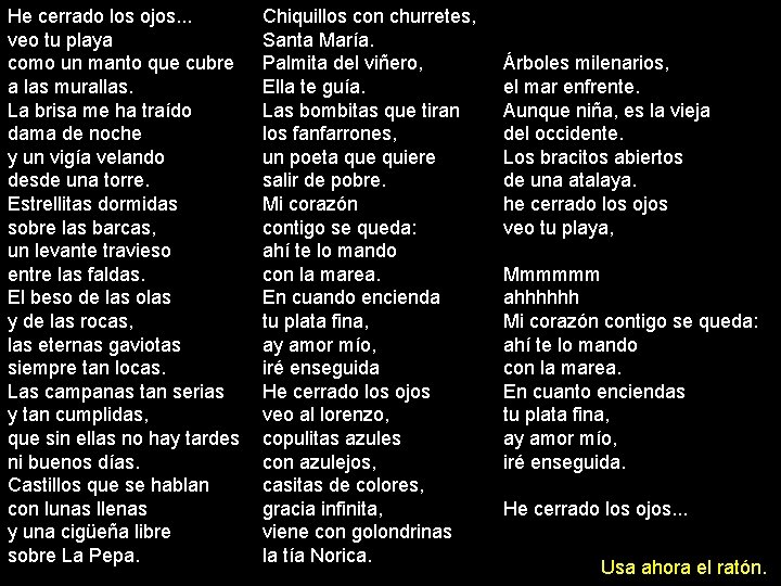 He cerrado los ojos. . . veo tu playa como un manto que cubre a las murallas. La brisa me ha traído dama de noche y un vigía velando desde una torre. Estrellitas dormidas sobre las barcas, un levante travieso entre las faldas. El beso de las olas y de las rocas, las eternas gaviotas siempre tan locas. Las campanas tan serias y tan cumplidas, que sin ellas no hay tardes ni buenos días. Castillos que se hablan con lunas llenas y una cigüeña libre sobre La Pepa. Chiquillos con churretes, Santa María. Palmita del viñero, Ella te guía. Las bombitas que tiran los fanfarrones, un poeta que quiere salir de pobre. Mi corazón contigo se queda: ahí te lo mando con la marea. En cuando encienda tu plata fina, ay amor mío, iré enseguida He cerrado los ojos veo al lorenzo, copulitas azules con azulejos, casitas de colores, gracia infinita, viene con golondrinas la tía Norica. Árboles milenarios, el mar enfrente. Aunque niña, es la vieja del occidente. Los bracitos abiertos de una atalaya. he cerrado los ojos veo tu playa, Mmmmmm ahhhhhh Mi corazón contigo se queda: ahí te lo mando con la marea. En cuanto enciendas tu plata fina, ay amor mío, iré enseguida. He cerrado los ojos. . . Usa ahora el ratón.