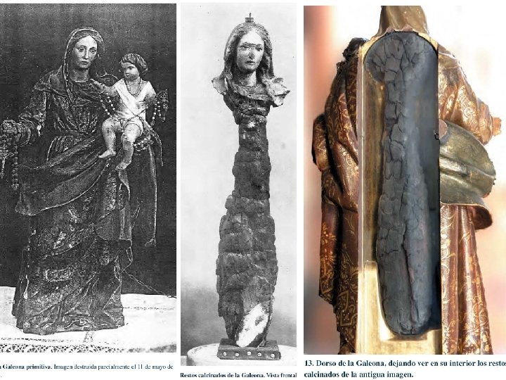 El cuerpo de la primitiva Galeona se quemó el mismo día que la Patrona. Pero, inexplicablemente, se salvó de ella la cabeza. Y el Niño Jesús, que alguien se llevó y que luego, cuando se enteró que iban a reconstruir la imagen de la Virgen, devolvió secretamente. Y los frailes dominicos mandaron rehacer, a partir de la cabeza y sin que se perdiera el tizón quemado, el cuerpo de la Virgen. Y lo hizo D. Juan Luis Vasallo, el año 1945, conservando en su interior, a modo de reliquia, el leño quemado de su primer cuerpo y colocado de nuevo el Niño Jesús en el brazo izquierdo de la Virgen. Y así, en la imagen que hoy vemos, la cabeza de la Madre y el Niño son de la primera Galeona, y el cuerpo, una perfecta reconstrucción del anterior.