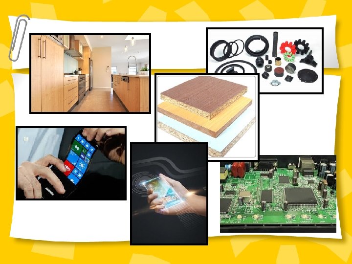 POLYMERS made from long chain molecules which may have cross linking bonds affecting flexibility/stiffness. Some examples of polymers are – plastics, PVC, nylon, polycarbonate, acrylic, epoxy resin, formaldehyde, neoprene, natural rubber, elastic bands, melamine (resin in construction material)