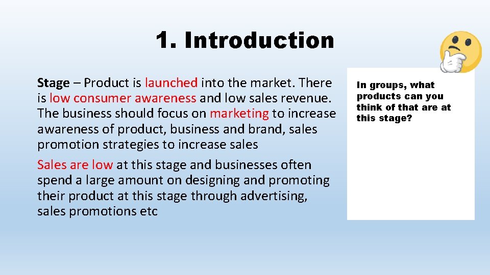 1. Introduction Stage – Product is launched into the market. There is low consumer awareness and low sales revenue. The business should focus on marketing to increase awareness of product, business and brand, sales promotion strategies to increase sales Sales are low at this stage and businesses often spend a large amount on designing and promoting their product at this stage through advertising, sales promotions etc In groups, what products can you think of that are at this stage?