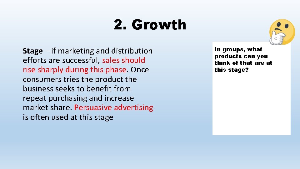 2. Growth Stage – if marketing and distribution efforts are successful, sales should rise sharply during this phase. Once consumers tries the product the business seeks to benefit from repeat purchasing and increase market share. Persuasive advertising is often used at this stage In groups, what products can you think of that are at this stage?