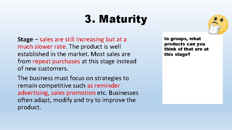 3. Maturity Stage – sales are still increasing but at a much slower rate. The product is well established in the market. Most sales are from repeat purchases at this stage instead of new customers. The business must focus on strategies to remain competitive such as reminder advertising, sales promotion etc. Businesses often adapt, modify and try to improve the product. In groups, what products can you think of that are at this stage?