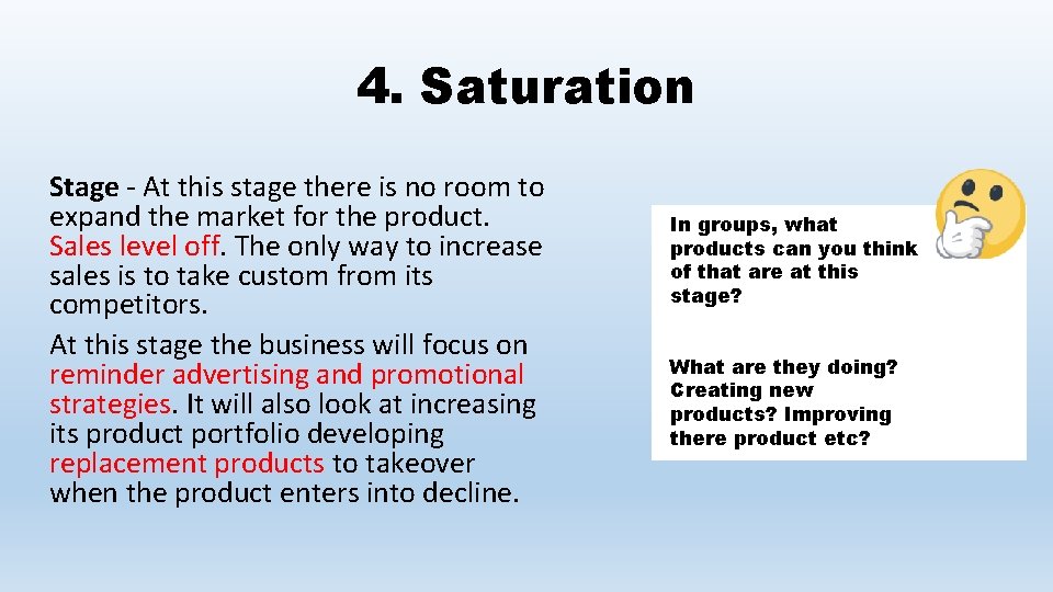 4. Saturation Stage - At this stage there is no room to expand the market for the product. Sales level off. The only way to increase sales is to take custom from its competitors. At this stage the business will focus on reminder advertising and promotional strategies. It will also look at increasing its product portfolio developing replacement products to takeover when the product enters into decline. In groups, what products can you think of that are at this stage? What are they doing? Creating new products? Improving there product etc?