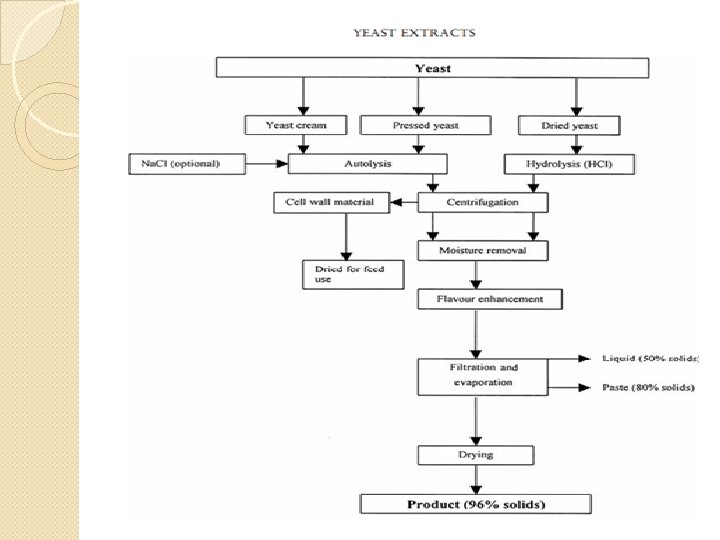 Yeast extract production Yeast extract is commercially available as either powders or pastes and has been extensively used as flavoring agent by the food industry. There are three distinct manufacturing practices for yeast extract production; autolysis, plasmolysis and hydrolysis. In this lab. We will discuss the autolysis process and hydrolysis